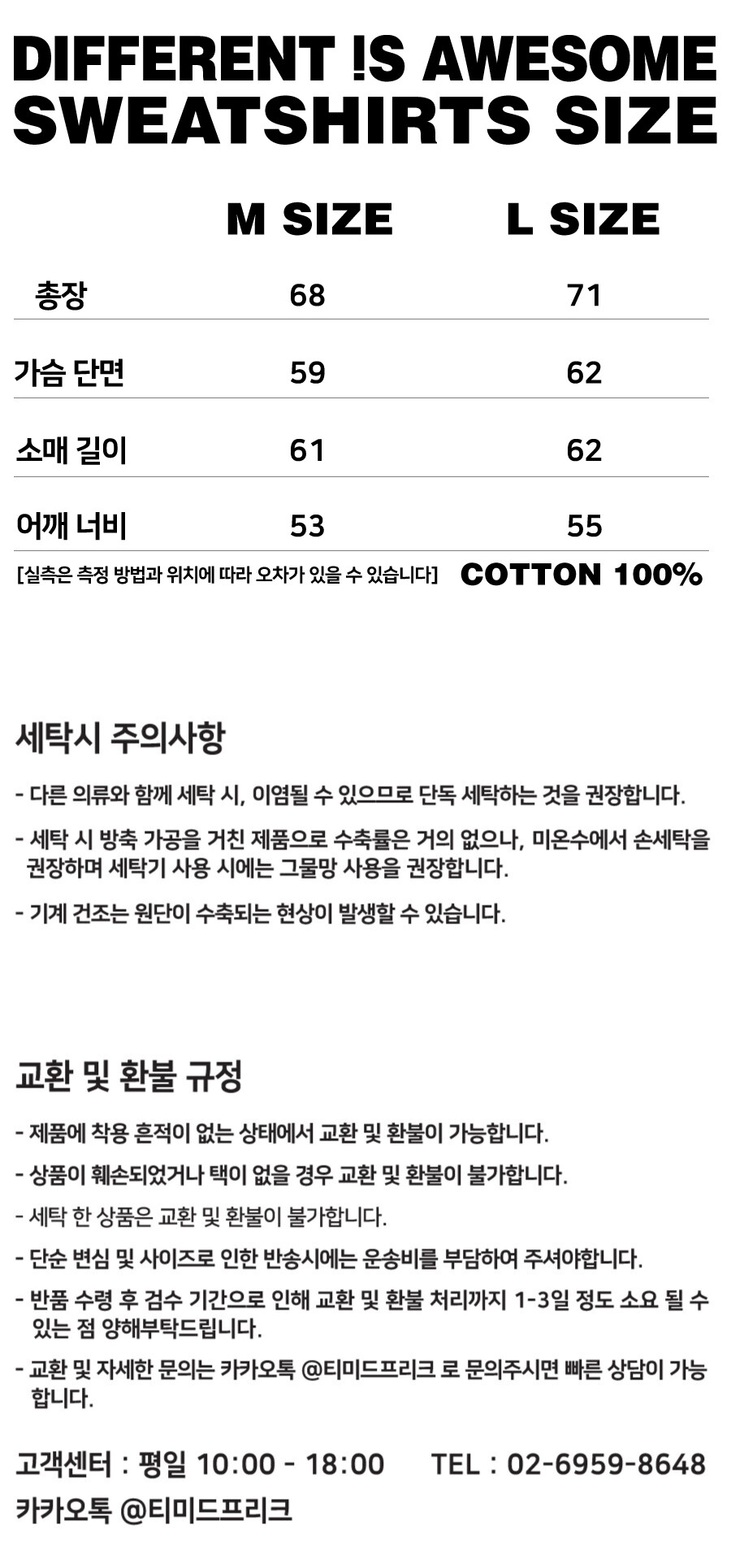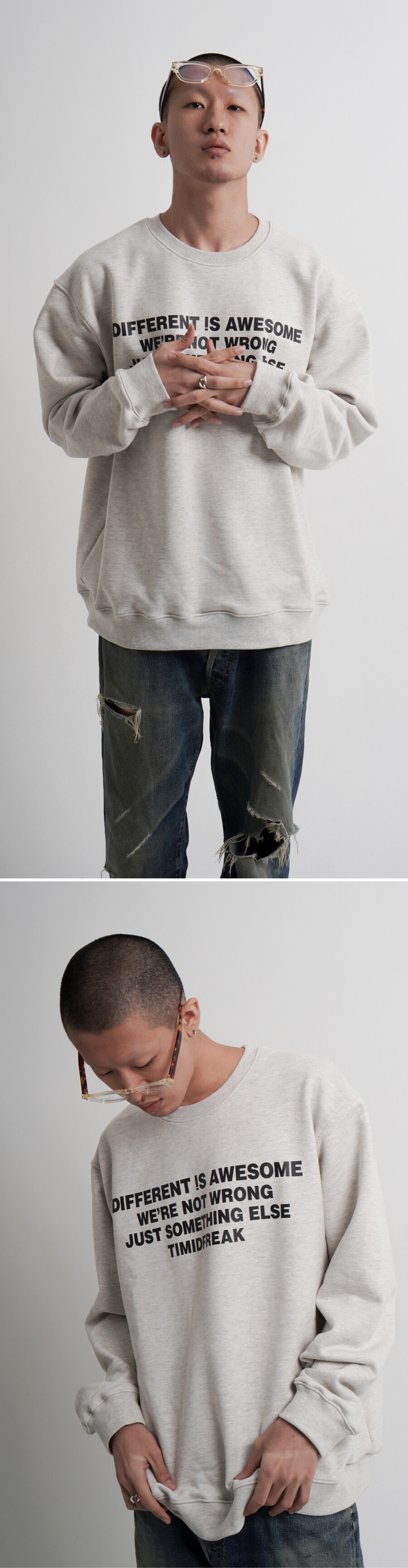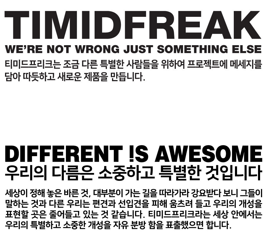 우리의 다름은 특별하고 멋진 것! 이라는 메세지를 그래픽화한 맨투맨 제품입니다. 고중량 원단에 덤블 텐타 가공으로 오랜 기간 변형 없이 착용 하실 수 있습니다. 티미드프리크라는 세상 안에서는 우리의 특별하고 소중한 개성을 자유 분방 함을 표출했으면 합니다.