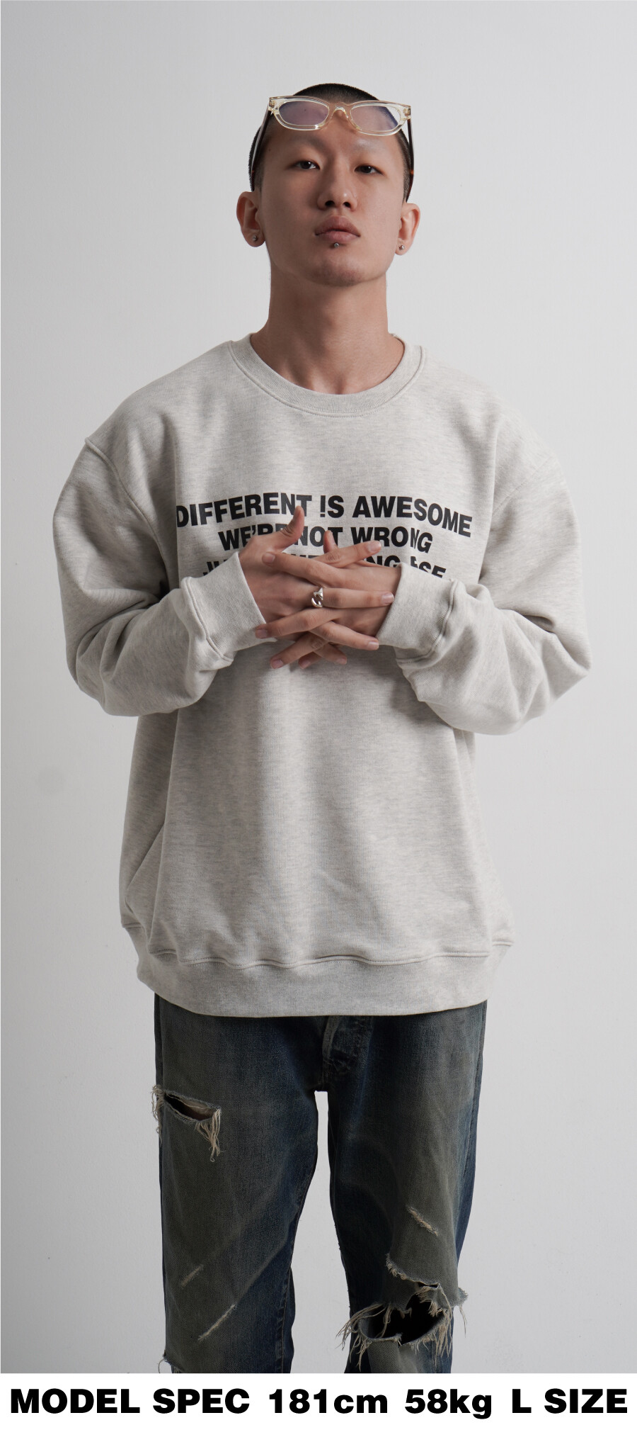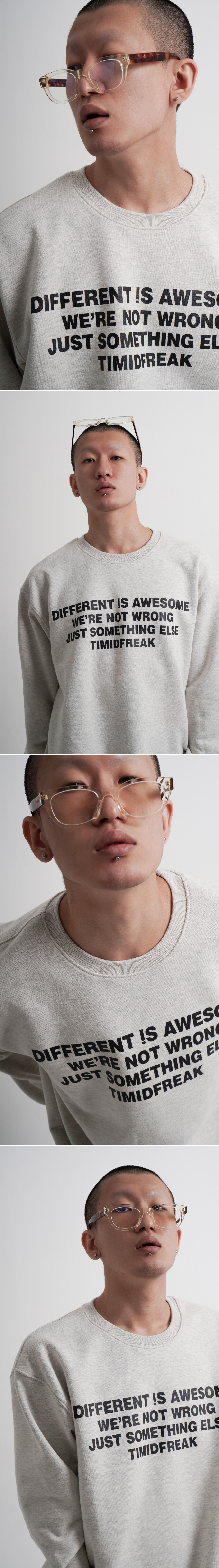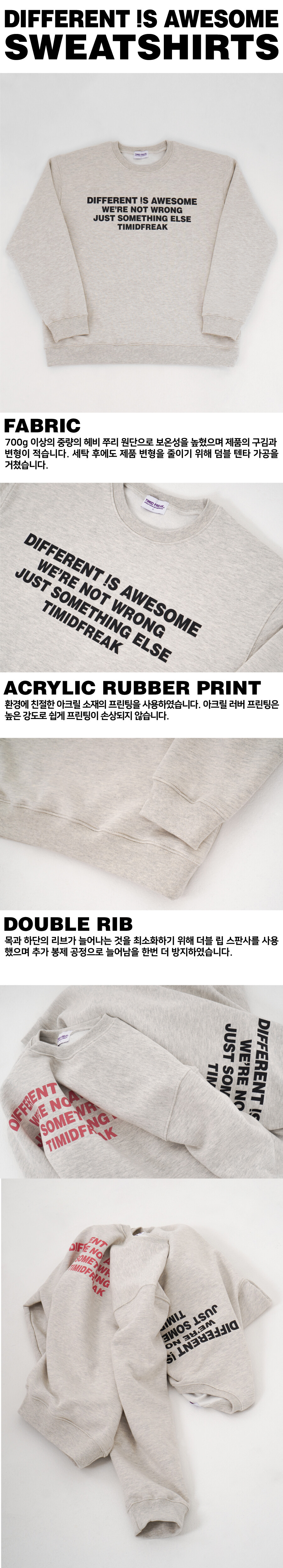 우리의 다름은 특별하고 멋진 것! 이라는 메세지를 그래픽화한 맨투맨 제품입니다. 고중량 원단에 덤블 텐타 가공으로 오랜 기간 변형 없이 착용 하실 수 있습니다. 티미드프리크라는 세상 안에서는 우리의 특별하고 소중한 개성을 자유 분방 함을 표출했으면 합니다.