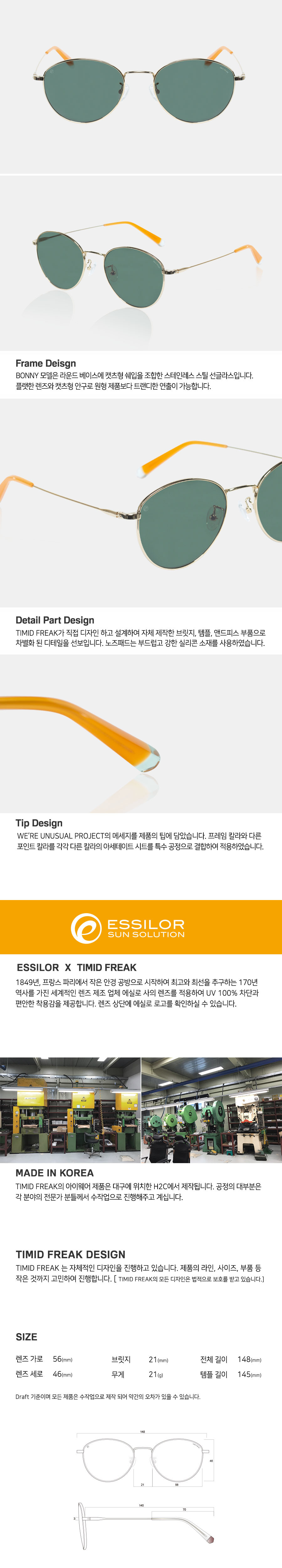 BONNY는 라운드 베이스에 캣츠형 쉐입을 조합한 스테인레스 스틸 선글라스입니다. 플랫한 렌즈와 캣츠형 안구로 원형 제품보다 트렌디한 연출이 가능합니다. 골드 칼라 프레임에 오렌지+그린 아세테이트 팁과 99.9% UV 차단이 되는 에실로 사의 렌즈를 사용하였습니다.