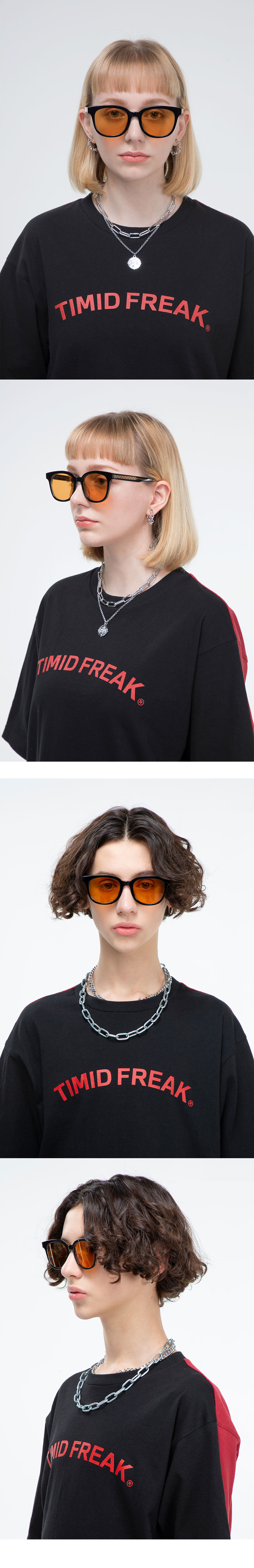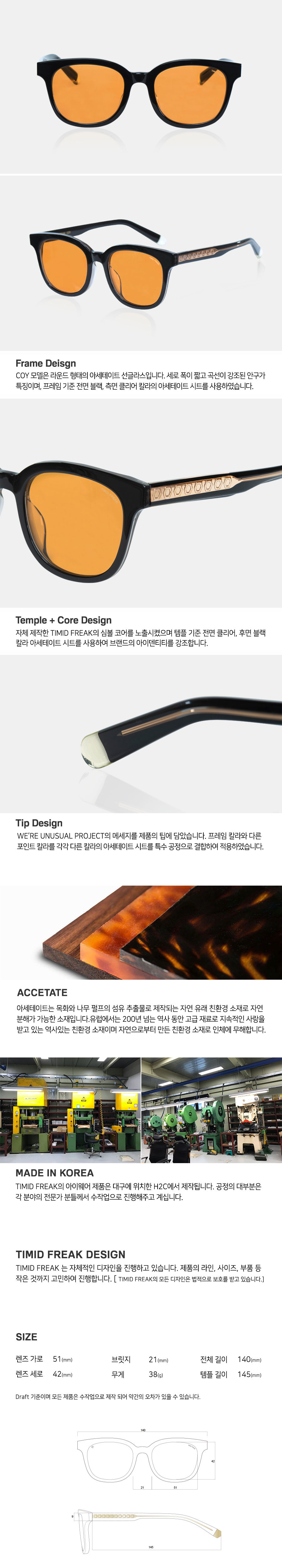 COY는 라운드 형태의 아세테이트 선글라스입니다. 세로 폭이 짧고 곡선이 강조된 안구가 특징입니다. 템플 옆면에 TIMID FREAK의 심볼 코어를 노출시켰으며 프레임 전면은 블랙, 측면은 클리어 칼라 아세테이트를 사용하여 브랜드 아이덴티티를 강조합니다. 99.9% UV차단이 되는 오렌지 칼라 틴트 렌즈를 사용하였습니다.