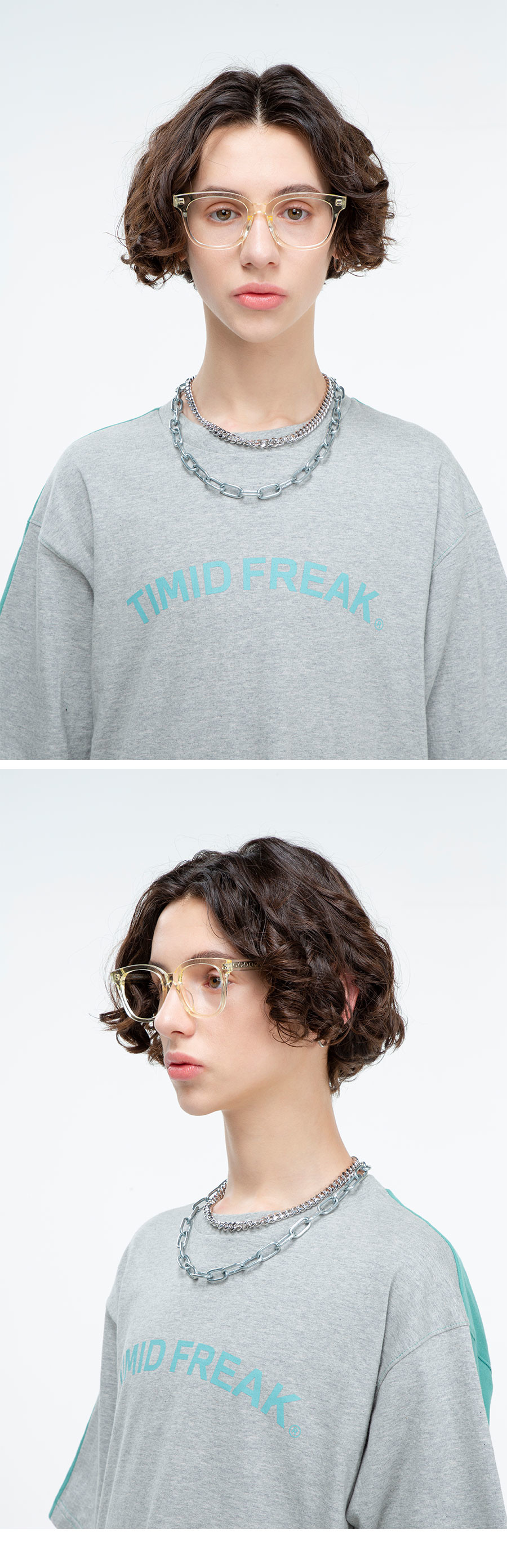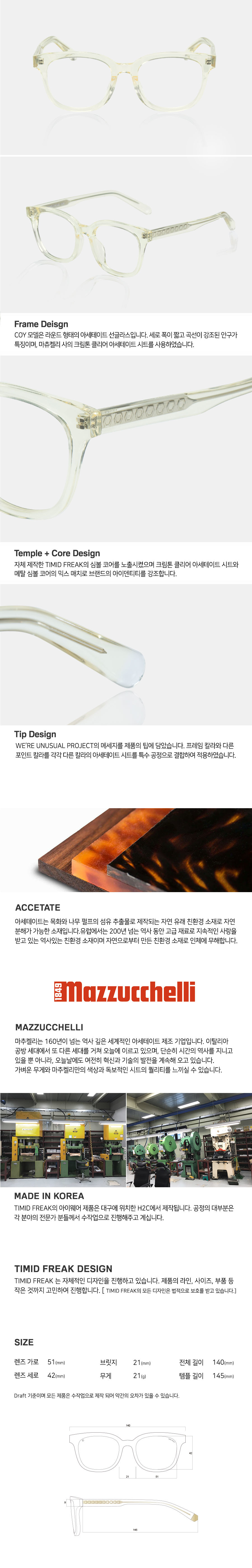 COY 모델은 라운드 형태의 아세테이트 안경입니다. 세로 폭이 짧고 곡선이 강조된 안구가 특징으로 템플 옆면에 TIMID FREAK의 심볼 코어를 노출시켰으며 마츄켈리 사의 크림톤 클리어 아세테이트를 사용하였습니다.