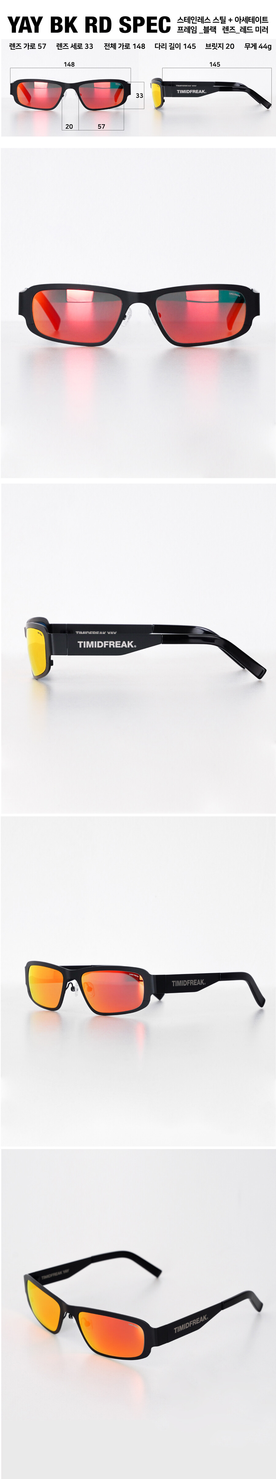 YAY는 커브가 많은 프레임과 미러 렌즈를 사용하여 레트로한 무드와 사이버틱한 렌즈 칼라로 제작되었습니다. 스테인레스 블랙 프레임과 다리+아세테이트 팁을 조합하였으며 고글 스타일의 레드+옐로우 미러 렌즈와 다리 외부에 로고를 각인하였습니다.